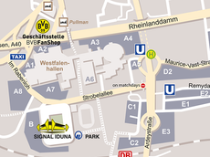 Auf der BvB Internetseite finden Sie eine Skizze und weitere Informationen für die Anreise zum SIGNAL IDUNA PARK.